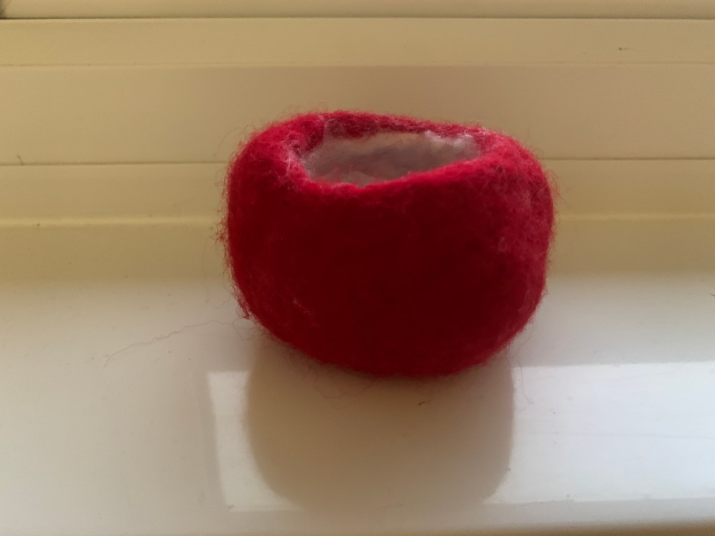Despite my low expectations of my innate ability to be any good at any craft, in such a place it’s natural to have a go at new things and see if one of them might reveal a previously unknown talent. My very first weekend I was invited to a wine and felting evening, during which Jo showed a bunch of novices how to felt. Results included a beautiful beach scene, lots of bowls and my misshapen red object… although I do use it to keep coins in. Felting was clearly not the craft I was looking for.