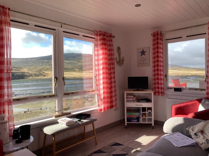 Most of my weekends away in the Falklands have been to outer, smaller islands, drawn there by the attraction of seeing some of the spectacular wildlife.  However, there are other weekend options on East and West Falkland where farms have created self-catering properties and new income sources.  Often self-catering units are existing houses that are no longer lived in or in some cases purpose built.  The latter is what I’m staying in this weekend – the charming Beach Hut.