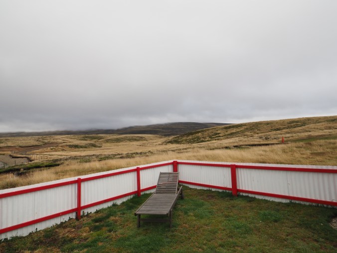 About half an hour from leaving MPC, just before arriving at Darwin, you turn right onto the North Camp road, which loops all the way around the top of East Falkland before coming right round back to Stanley.  This is a one and a bit vehicle wide road, which is predominantly clay, definitely slidey in the wet.  My instructions for finding the Beach Hut were – drive towards San Carlos and there’s a sign on the left .  I knew this was true because mid-summer I’d driven some friends round the North Camp road and seen it.  So I felt I knew how long it would take me to get there.  Of course, the reality of driving at dusk in poor visibility, when you’re not entirely sure where you’re going makes it a different experience.  I went across the cattle grids, with a sign occasionally telling me which farm I was passing through – Goose Green, Port Sussex, Head of the Bay.  I had gone past a few signs and wondered if I had missed mine.  The road went up and into the cloud, which was very low and wet. I really felt I had gone too far, the road wound down and I could see green grass around a bay and I then I saw the sign to the Beach Hut and all was well.