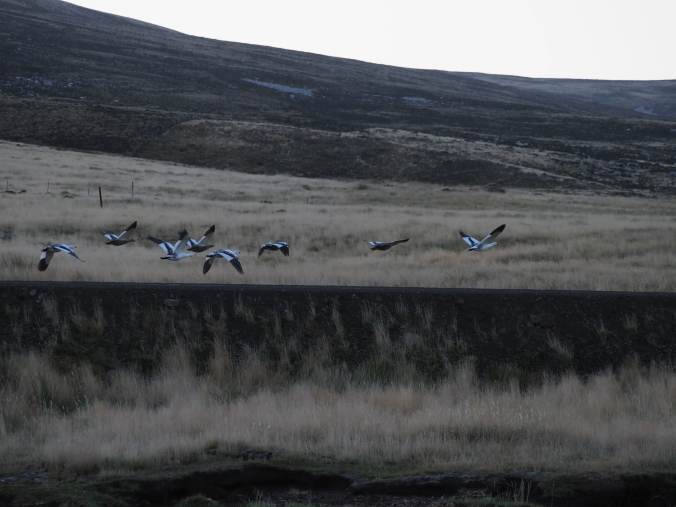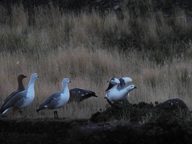 The next morning I bundled up against the pre-dawn cold and went outside to watch the asnerine rituals more closely. In the twilight the geese took to the water, after spending the night on the creek edge. I realised watching them that they were in family groups, sometimes quite large, I counted one with 11 individuals. I knew that Upland Geese adults pair for life but hadn’t really thought about how look each year’s brood would stay with them. Watching these groups, clearly the young adults stay for a considerable time – perhaps until next year’s breeding season.